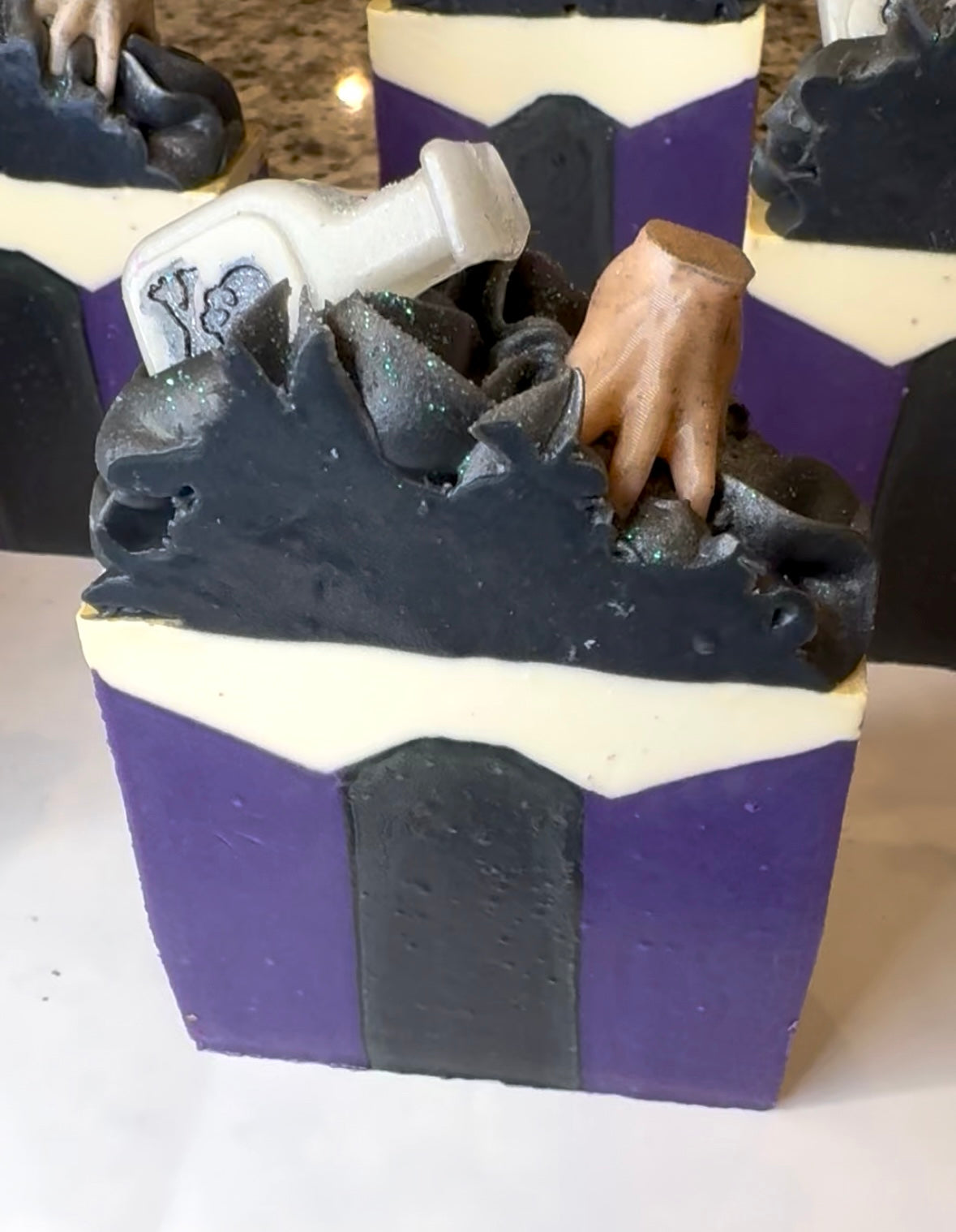 This is the making of “It’s a Wednesday Thing”. My Wednesday Addams inspired cold process soap. I chose to recreate the school uniform but with a little darker and more miserable color scheme, it’s designed with vertical stripes and accompanied by her white collar. I finished it off with a little poison and her bestie “Thing”. I used a vertical divider to create the vertical stripes, and hand crafted my own soap scraper to create the uniform collar..